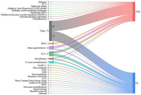 Noise and artifacts must be filtered from EEG data prior to analysis [104]. EEG data inherently exhibit instability, weakness, and high susceptibility to external interference. Errors in experimental setups, environmental noise, and artifacts from other biological signals adversely impact the overall signal. Preprocessing constitutes a key component of EEG signal processing, significantly enhancing the signal-to-noise ratio and establishing a reliable foundation for further analyses and interpretation [105]. This article reviews a range of preprocessing methods employed in the included studies, including filtering, independent component analysis (ICA), data segmentation, Z-score and min–max normalization, principal component analysis (PCA), re-referencing, soft-thresholding algorithms, sphere spline, FastICA, adaptive autoregression (AAR) models, adaptive noise cancellation (ANC), pseudo-subspace reconstruction (PSR), discrete and multilevel discrete wavelet transforms (DWT and MDWT), fast Fourier transform (FFT), among others. Table 5 summarizes the preprocessing methods used in studies that employ both TML and DL approaches. The left column enumerates the various preprocessing methods, while the right column provides details of the studies that implemented these methods. Figure 4 graphically presents the frequency distributions of various preprocessing methods, with the numbers after the colon (“:”) denoting the usage frequency of each method. Furthermore, the thickness of each ribbon strip corresponds proportionally to its frequency.