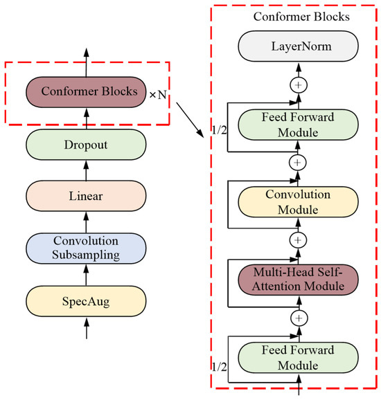 The Conformer model proposed by Gulati et al. [31] combines convolution and self-attention, building on the work presented in the literature [12]. Self-attention captures global interactions, while convolution effectively captures local correlations based on relative shifts, resulting in more effective outcomes than using either convolution or self-attention alone. The acoustic input network structure of the Conformer encoder, as illustrated in Figure 1, consists of four main components: the SpecAugment module [32], a convolution module (Convolution Subsampling), a linear layer (Linear), and a Dropout layer. The SpecAugment module is responsible for data augmentation of the filter bank (FBank); the Convolution Subsampling performs downsampling; the Linear layer reduces the feature dimensions; and the Dropout layer helps mitigate overfitting, thus achieving a regularization effect. A series of Conformer Blocks are then employed to process the input. The left side of Figure 1, displays the overall architecture of the Conformer encoder, while the right side illustrates the specific structure of the Conformer Block.
