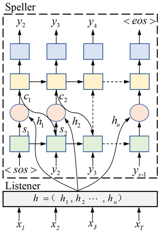 The attention-based model was first introduced in speech recognition tasks by the Listen, Attend and Spell (LAS) model [34], proposed by William Chan et al. This model is a sequence-to-sequence architecture inspired by machine translation tasks. The LAS model comprises three components: ‘Listen’, which serves as the encoder based on a recurrent neural network (RNN), ‘Spell’, which functions as the decoder also based on an RNN, and ‘Attend’, which is the attention layer that establishes a mapping relationship between the encoder and the decoder, while the specific RNN architectures used for the encoder, decoder, and attention mechanism may vary across different papers, the overall framework remains consistent, as illustrated in Figure 2.