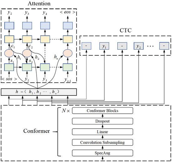 In 2014, Alex Graves [3] achieved end-to-end (E2E) speech recognition [4], leading to its widespread application in the field. The input to an E2E system consists of acoustic features or speech waveforms. Unlike traditional methods, E2E simplifies the integration of acoustic models, language models, and pronunciation dictionaries [5] into a sequence-to-sequence recognition module, enabling a direct conversion from speech to text. Currently, popular E2E speech recognition methods are primarily built upon three models: Connectionist Temporal Classification (CTC) [6,7], attention-based encoder–decoder (AED) [8,9], and Conformer [10,11]. These deep learning models are relatively easy to construct and fine-tune, and in certain application scenarios, they achieve recognition rates that surpass those of traditional speech recognition models. Furthermore, they enable flexible combinations of multiple models, leveraging the strengths of different foundational models to achieve improved performance [12,13].