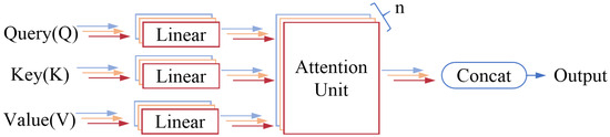 The attention mechanism that generates the query vector Q from the input sequence X is known as the self-attention mechanism. This mechanism typically employs a query-key-value () model, mapping the input sequence into Q, K, and V using different weight vectors. The attention scores computed by the scoring function reflect the relevance between Q and K. When the attention mechanism performs multiple mappings of the query-key-value vectors, it is referred to as the multi-head attention mechanism, as illustrated in Figure 4.