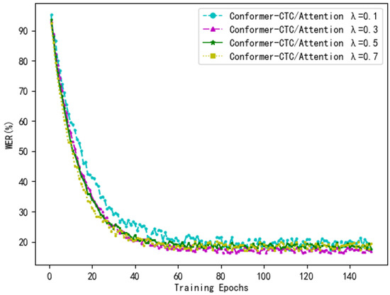 In this study, FBank is used as the input feature, and the Adam optimizer is employed during training, with a learning rate adaptation strategy. The Conformer encoder structure is enhanced, setting the number of encoder layers to 12, with 4 heads in the multi-head self-attention module, and the vector dimension for encoding information is set to 256. The number of units in the hidden layer is set to 2048. The Swish activation function is used, and the dropout rate is set to 0.1, with a batch size of 32. In the Transformer decoder structure, the number of decoder layers is set to 6, and the decoder output dimension, dropout rate, number of heads, and other parameters are the same as those in the encoder, also utilizing the Swish activation function.