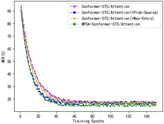 The four models were tested on the Tibetan-A and TIBMD@MUC2 datasets. As shown in Table 5, the WER of Model 2, Conformer-CTC/Attention (+Prob-Sparse), significantly decreased compared to the baseline model, with rates of 0.5% and 6%, respectively. Additionally, the computational complexity of the model reduced from O() to O(N), demonstrating the effectiveness of the proposed probability-sparse self-attention mechanism. Model 3, Conformer-CTC/Attention (+Max-Entro), exhibited a modest decrease in WER relative to the baseline, with rates of 3.3% and 9.1%, indicating that the improvements based on the maximum entropy CTC algorithm are effective. Overall, there is an enhancement in the speech recognition rate of the Conformer-CTC/Attention model. Model 4, MPSA-Conformer-CTC/Attention, showed a significant decrease in WER compared to the baseline model, with rates of 10.68% and 9.57%, while the model’s complexity also decreased to O(N). Experimental results confirm that the improved model not only reduces memory consumption and training time but also enhances the model’s generalization ability and accuracy.