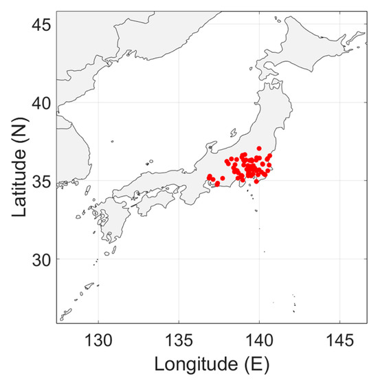 Geographical distribution of the man-made noise measurements in Japan. The measurements cover the central part of the Honshou island.