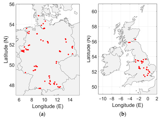 (a) Geographical distribution of the man-made noise measurements in Germany. No measurements were made in Quiet Rural areas, as this exceeded the capability of the equipment. (b) Geographical distribution of the man-made noise measurements in the United Kingdom.
