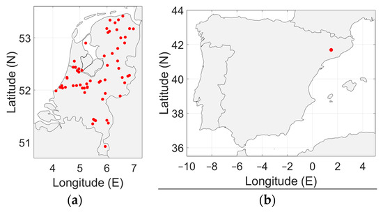 (a) Geographical distribution of the man-made noise measurements in the Netherlands. (b) Geographical distribution of the man-made noise measurements in Spain (single location).