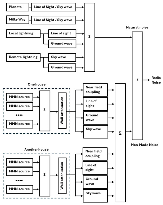 The physical model could may its input from the building density, the density of devices per building, the emitted effective isotropic radiated power (EIRP) of each device, the distance from the buildings to the sensor, the propagation paths on the frequency of observation. There will be multiple propagation paths from source to sensor possible: direct coupling in the Near Field, Line-of-Sight, ground wave, sky wave. These propagation paths were described in [13,14] and can be seen as parallel paths to the sensor, see Figure 10. This model will be supported mathematically, using existing models for radio wave propagation and wall attenuation.