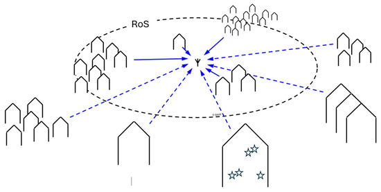 The Radius of Significance (RoS) contains the sources that predominantly define the man-made noise level at the sensor. The outlined shapes represent houses, the stars in one house depicture that each house contains multiple sources.