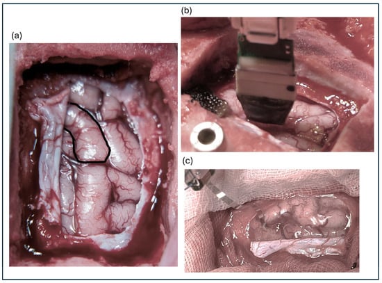 (a) Exposed cortical surface with the primary somatosensory cortex highlighted. (b) Implanted microelectrode array positioned on the cortex. (c) Close-up view of the microelectrocorticography (µECoG) array.