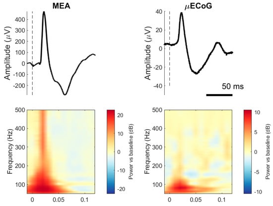 Somatosensory evoked potentials (SEPs) from two pigs, one recorded with an MEA and the other with an uECoG. (Top row): The line represents a trial-averaged single electrode (50 trials, one animal). Dashed lines indicate stimulation onset. (Bottom row): Indicates the time–frequency representation of the same SEPs with decibel normalisation.