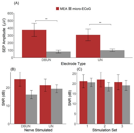 By analysing SEPs resulting from the stimulation to the DBUN and the UN, the results showed a significant effect of the interface type (MEA vs. µECoG, p = 0.01) and no significant effect of SEP amplitude based on the nerve stimulated (p = 0.99) (Figure 3A). SEPs recorded with the MEA had a higher amplitude than recordings with the μECoG for both stimulations to the DBUN.