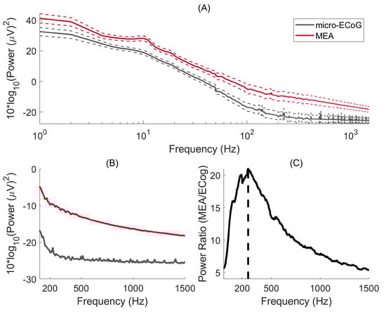 (A) Micro-ECoG and MEA power spectral density are plotted as a function of frequency. The continuous lines represent the median PSD, whereas the dashed lines indicate the standard error of the mean. (B) PSDs are represented on a linear scale. (C) Power ratio between MEA and micro-ECoG: the maximum power ratio occurs at a frequency of 264 Hz.