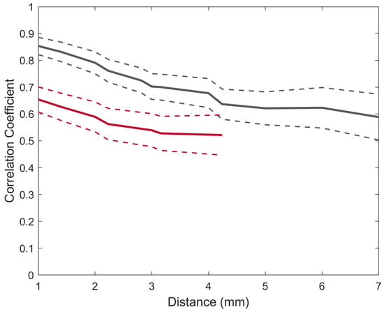 The average correlation between equidistant electrodes for broadband SEPs was recorded using a µECoG (grey) and an MEA (red). The dashed lines indicate the standard error of the mean.