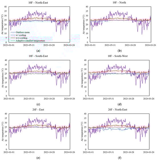 As shown in Figure 2f,k, both the 26F-North-East zone and 42F-North zone recorded indoor air temperatures as being lower than the ACT for 32% of the time across the testing period. On these days, the indoor air temperatures were, on average, 0.85 °C and 0.83 °C lower than the ACT, respectively, indicating that these zones were overcooled. Energy savings could be achieved by adjusting the set-point temperature of these zones to be above the ACT.