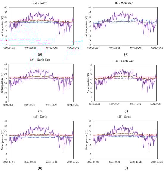 Daily mean outdoor temperature and indoor air temperature at sampling zones. (a–d) Measurements recorded from the 10th floor, (e–g) measurements recorded from the 26th floor, (h) measurements recorded from the basement floor, and (i–l) measurements recorded from the 42nd floor.