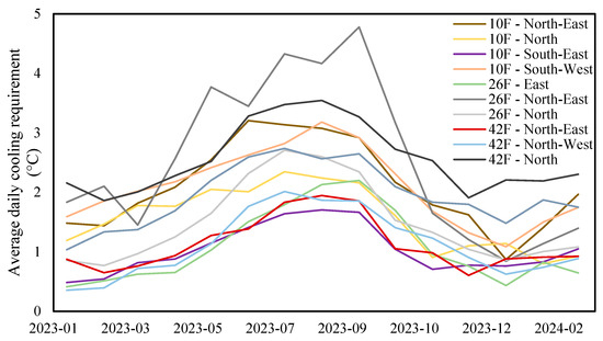 Below, Figure 3 presents the average daily cooling requirement of each zone over the 15 months. Of all the zones, 42F-North exhibited the highest average daily cooling demand, with an annual average of 2.55 °C. However, during the summer season, 26F-North-East stood out with the highest cooling requirement. In September 2023, it peaked at 4.8 °C, indicating the need for intensive cooling during hot weather conditions.
