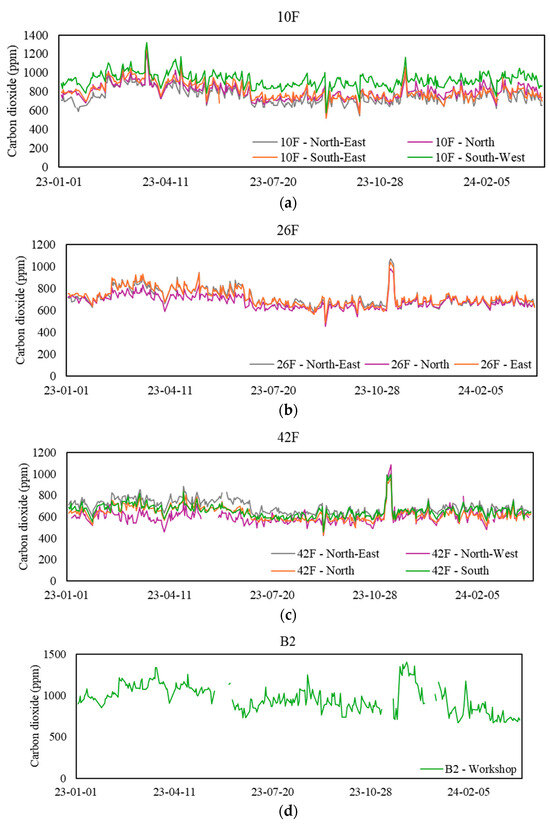 Daily mean carbon dioxide (CO2) levels at sampling zones. (a) Values for the 10th floor, (b) values for the 26th floor, (c) values for the 42nd floor, and (d) values for the basement floor.