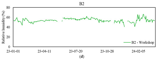 Daily mean relative humidity levels at sampling zones. (a) Values for the 10th floor, (b) values for the 26th floor, (c) values for the 42nd floor, and (d) values for the basement floor.