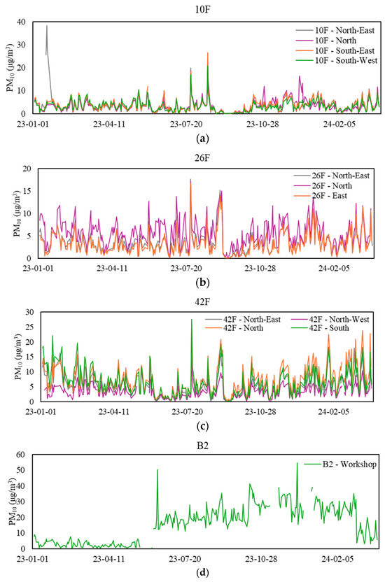 Daily mean PM10 levels at sampling zones. (a) Values for the 10th floor, (b) values for the 26th floor, (c) values for the 42nd floor, and (d) values for the basement floor.
