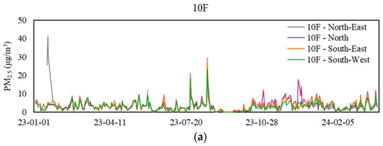 Daily mean PM2.5 levels at sampling zones. (a) Values for the 10th floor, (b) values for the 26th floor, (c) values for the 42nd floor, and (d) values for the basement floor.