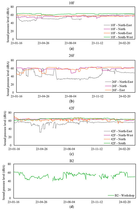 Daily mean sound pressure levels (SPL) at sampling zones. (a) Values for the 10th floor, (b) values for the 26th floor, (c) values for the 42nd floor, and (d) values for the basement floor.