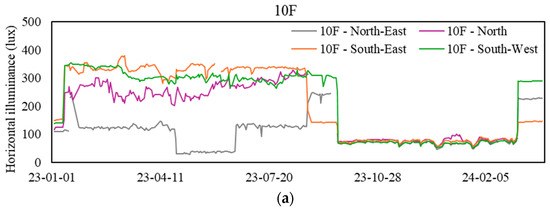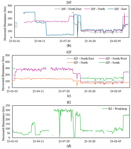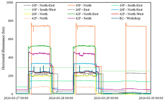 Daily mean horizontal illuminance (light) levels at sampling zones. (a) Values for the 10th floor, (b) values for the 26th floor, (c) values for the 42nd floor, and (d) values for the basement floor.