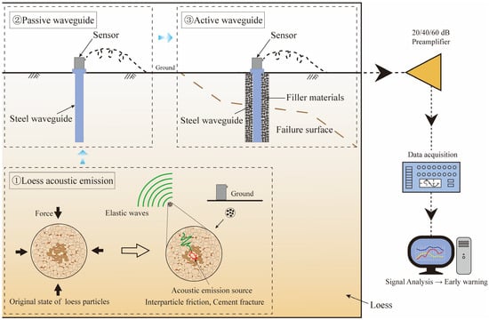 Two types of AE waveguide systems are currently available for slope warning: active and passive waveguides. Passive waveguides are commonly utilized for AE monitoring of rocky slopes. In a study conducted by an Italian scholar [], waveguide rod grout was inserted into rocky slopes to monitor their stability. The study demonstrated that AE monitoring can effectively detect deformation in rocky slopes and that the AE data are sensitive to even minor changes in stress. However, when monitoring soils with AE, active waveguide systems are typically preferred due to the low level of AE signals and considerable attenuation during propagation []. The signals primarily arise from the mutual friction between particles of the fill material [,]. Smith (2017) [] conducted indoor model tests in which an active waveguide was inserted into a large soil sample during shearing, demonstrating that the system could relate measured AE parameters with slope movement velocity, providing early warning information before destabilization. Similarly, Berg (2018) [] used an active waveguide system to monitor slopes, establishing a quantitative relationship between AE parameters and slope movement velocity. This system can be used for early warning. However, collecting sufficient deformation and displacement data to establish the relationship between the AE signal and the moving speed is challenging for loess collapse geohazards. This difficulty is attributed to the weak deformation before damage and its transient nature. Therefore, the active waveguide system suitable for loess collapse must be explored, and the co-evolution relationship between loess collapse development and AE processes must be established.