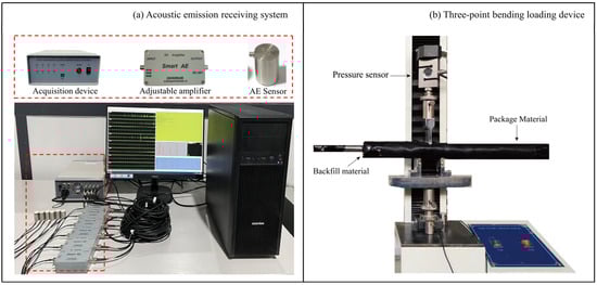 The servo universal testing machine and DS5-8B AE signal analyzer (Beijing Softland Times Technology Co., Ltd., Beijing, China) were used for testing (Figure 2). The AE waveguide model is placed on the loading equipment. The two ends of the wrapping materials are then closed to prevent the loss of filling materials during the test, and the test displacement is controlled at 1 mm/min.