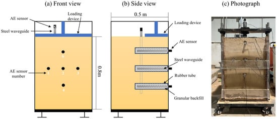 A collapse test system was designed using a model box, a loading device, and an AE monitoring device, as shown in Figure 3. The system features a simple structure, high repeatability, and low interference noise during testing. The testing apparatus comprises multiple acrylic panels, with dimensions of 0.5 × 0.6 × 0.8 m, positioned on the base of the loading device. The front acrylic panels of the model apparatus can be opened, allowing for direct observation of the model’s deformation during testing. A hydraulic jack was used to apply thrust, simulating the vertical pressure that could lead to loess collapse. The jack was secured to steel columns on both sides of the model test box, with the thrust directed perpendicular to the bottom of the box. Pressure sensors were also installed on the jacks to measure pressure changes throughout the test, and the data were displayed and recorded in real-time.