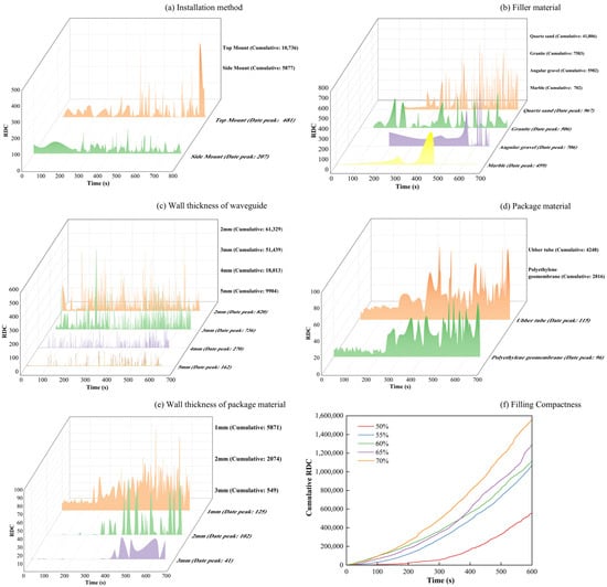 According to Figure 4a, the cumulative ringing count of the top-mounted transducer is 10,736 while that for the side-mounted transducer is 5877. At the start of the loading test, AE signals were detectable by either the top-mounted or side-mounted transducer, with similar trends observed for each mounting method. However, the response trend from the top-mounted transducer became more pronounced after a certain period of loading. Regarding the filling materials (Figure 4b), AE signals from quartz sand and granite were more pronounced and detected earlier. The cumulative ring counts for quartz sand, granite, angular gravel, and marble were 41,806, 7583, 5982, and 702, respectively. The signals generated by quartz sand exhibit a more pronounced response during loading, particularly due to AE signals arising from extrusion, friction of the filler material, and shear misalignment. The waveform parameters of these signals are notably larger. Regarding the steel waveguide wall thickness (Figure 4c), the AE signal is most evident with a wall thickness of 2 mm, where the cumulative ring counts reach 61,329, 51,439, and 18,013 for 2, 3, and 4 mm wall thicknesses, respectively. The cumulative AE ring count is 9904 for a wall thickness of 5 mm. The AE signals obtained from the four different wall thicknesses exhibit similar trends throughout the loading process. In terms of wrapping materials (Figure 4d), the rubber tube and the polyethylene geomembrane produce distinct AE signals. The rubber tube has a cumulative ring count of 4248, while the polyethylene geomembrane has 2816. The response trend of the AE signals obtained from both types of wrapping materials remains consistent during the loading process. For the wall thickness of wrapping materials (Figure 4e), the AE signals are most pronounced when the rubber tube has a wall thickness of 1 mm. The cumulative AE ring counts are 5871, 2074, and 549 for wall thicknesses of 1, 2, and 3 mm, respectively. Figure 4e shows the response trend of the AE signal parameter for the rubber tube with a 1 mm wall thickness throughout the loading process, showing consistently high magnitude values. The AE signal parameter for the 1 mm thick rubber tube exhibits the most notable response trend during loading, with a markedly larger magnitude compared to the other wall thicknesses.