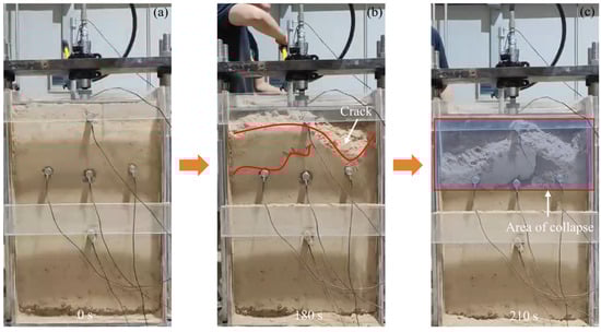 Collapse model test procedure. (a–c) represent the process by which the model was destroyed during the experiment.