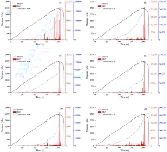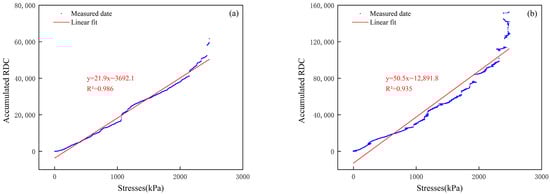 Test stresses–RDC, cumulative RDC relationship. (a) Sensor #1; (b) sensor #2; (c) sensor #3; (d) sensor #4; (e) sensor #5; and (f) sensor #6.