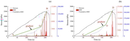 Figure 8a shows almost no AE ring counts in the early stage of the test, but they gradually appeared at 50 s. At 178 s, a sudden increase in ringing counts was observed, which also gradually increased until reaching its peak. The green line segment in the figure indicates the change in the slopes of the cumulative ring counts before and after the sudden change. Figure 8a shows that the slope of segment OA was 504, whereas that of segment OB was 2387, representing an increase of 474%. Moreover, the time point of the sudden change in slope occurred 32 s before the collapse. As shown in Figure 8b, the ringing counts suddenly increased at 175 s. The slope of the OC segment before the sudden change was 1595, and that of the OD segment after the sudden change was 4081, representing an increase of 256%. The time point of the sudden change in the slope was 35 s earlier than the collapse. The AE ringing counts exhibit a strong correlation with the loess collapse process, effectively reflecting this procedure.