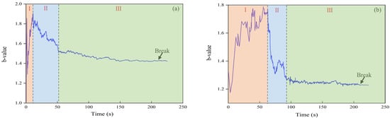 As an important parameter for investigating the failure mechanical mechanism of the loess collapse, b-values can be used to reflect changes in microfracture scale inside the loess collapse. A decrease in b-value indicates an increase in the proportion of large events inside the loess collapse, that is, the number of large-scale microfractures notably increases []. The results indicate that when the b-value is large, the AE signal amplitude collected in the corresponding sampling window is low, suggesting that the vibrations generated by AE events during the loess collapse are weak, primarily resulting in small cracks. Conversely, when the b-value is small, the AE signal amplitude is high, indicating stronger vibrations from AE events in the loess collapse, which are generally associated with larger cracks. If the b-value remains unchanged over a period, then the size of AE events also remains constant, indicating that the fracture scale within the sample is relatively stable. Conversely, when the b-value exhibits small amplitude changes, the fracture scale within the sample undergoes abrupt changes. Substantial changes in b-values indicate a transient mutation state of loess collapse [,]. Therefore, changes in the b-value can serve as an important precursor for monitoring damage associated with loess collapse. The concept of the b-value was first introduced in seismology, where researchers described the relationship between decreasing earthquake frequency and magnitude (Gutenberg et al., 1994) [] and proposed the following empirical Formula (2):