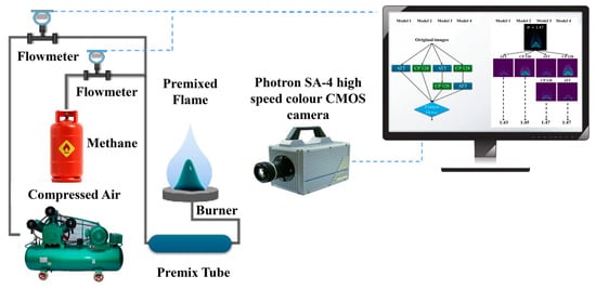 The experimental setup (Figure 1) comprised a variety of essential equipment necessary for conducting comprehensive combustion studies. This equipment included methane gas cylinders, air compressors, manometers, flow meters, a premix tube, burners, a Photron SA-4 high-speed color CMOS camera, personal computers, and a gas tube. A key component of this configuration was the computer-operated flowmeter, which played a crucial role in accurately regulating the flow rates of fuel gas and air, thereby achieving the desired Φ for the mixture. Following meticulous calibration, the premixed mixture was subsequently introduced into the main lamp burner through a precisely selected nozzle with a diameter of 10 mm, which was critical for establishing optimal combustion conditions for the study.