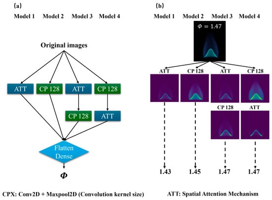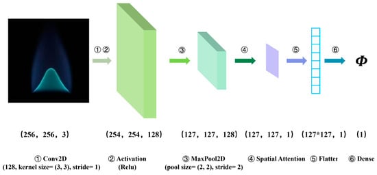 This study presents an attention-based convolutional neural network (ACN) model designed for predicting Φ in methane combustion flames. This deep learning methodology surpasses conventional color modeling techniques by eliminating the need for prior knowledge in feature extraction and exhibiting improved generalization capabilities for previously unencountered combustion states [,]. The efficacy of deep learning is attributed to its ability to extract essential features directly from data through a generalized learning process. During the supervised fine-tuning phase, regression models are developed to elucidate the nonlinear relationships between the extracted features and Φ, representing a significant development in the field of combustion analysis.