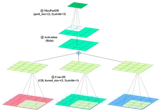 CP128 incorporates Conv2D, activation, and MaxPool2D operations, as delineated in Equations (1a)–(1c). The initial phase of this process involves a 3 × 3 convolution operation, with the kernel parameters established through model back-training. This phase is essential for the detection of various features, including color, edges, textures, and shapes within RGB images. During the convolution process, a cross-correlation function, as described in Equation (1a), is utilized. This function combines the pixel values of the convolution kernel matrix K with those of the input matrix I, resulting in the output matrix O.