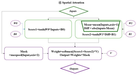 Figure 5 presents ATT, an essential element of the hidden layer that processes multiple tensors (Table 1). ATT functions in two primary phases. In the first phase, it applies a nonlinear transformation using the hyperbolic tangent function (tanh) to the input tensors (CP128 output tensors), resulting in the generation of the first attention score tensor, referred to as Score1. Simultaneously, these input tensors are subjected to additional processing to create a ‘Diff’ tensor, which captures the absolute differences between each tensor element and the mean value of its corresponding row. Subsequently, the ‘Diff’ tensor is processed through a similar nonlinear transformation to produce Score2, the second component of the attention score matrix.