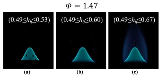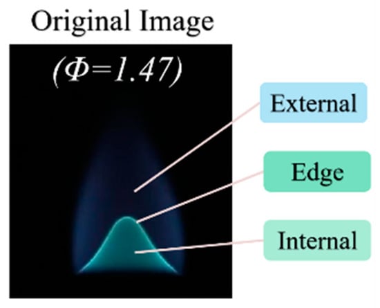 In images of premixed hydrocarbon flames captured by CCD cameras, a dual flame structure is evident, consisting of an inner flame that burns in a highly premixed mode and an outer flame that consumes incompletely burned intermediates []. The digital flame color discrimination (DFCD) technique, which was developed to minimize the impact of the external flame on image analysis, effectively reduces the impact of diffuse flames in RGB channels through H-channel threshold segmentation [,]. However, the effectiveness of this method in accurately measuring Φ is constrained by its dependence on subjective judgment for threshold adjustments.