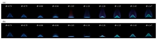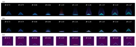 A total of 10 sets of images depicting methane flame combustion were compiled, with Φ ranging from 0.73 to 1.47. Each set comprised 100 images captured using a digital color camera, which were subsequently cropped and resized to dimensions of 256 × 256 pixels. Figure 2 presents a selection of these images, effectively illustrating the variation in Φ.