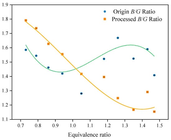 Figure 11 depicts the variations in B/G ratios obtained from flames in relation to Φ, both prior to and following the application of DFCD treatment. Before the treatment, the B/G values display a disordered pattern. However, subsequent to the treatment, they demonstrate a closer alignment with the cubic regression fitting curve. Despite this enhancement, significant discrepancies remain evident, particularly during the rich combustion phase.