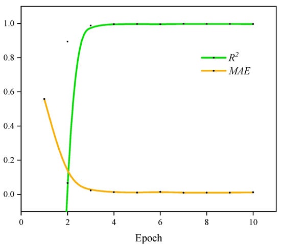 Figure 13 presents the changes in the coefficient of determination (R2) and the mean absolute error (MAE) during the model training process as a function of the number of epochs. The improvement in model performance can be analyzed from two key points of change. For the initial rapid adaptation, in the early stages of training, the R2 value rapidly increases, and the MAE value rapidly decreases, indicating that the model quickly adapts to the data characteristics and improves prediction accuracy within the first four epochs. This phenomenon benefits from the dynamic learning rate adjustment strategy of the Adam optimizer, which enables the model to rapidly adjust its parameters and quickly capture patterns in the data during the initial stages. For the convergence and stability, as the number of epochs increases, the R2 and MAE curves gradually stabilize and ultimately converge. This stable trend indicates that the model’s performance has approached its upper limit and that there is no evidence of overfitting or curve oscillation. The smooth convergence of the curves suggests that the model’s training process is stable, especially with the help of the Adam optimizer, which effectively avoids overfitting and ensures the model’s generalization ability to unknown data.