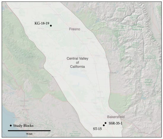 Map showing the location of the study blocks relative to the Central Valley of California, U.S., and the closest cities.