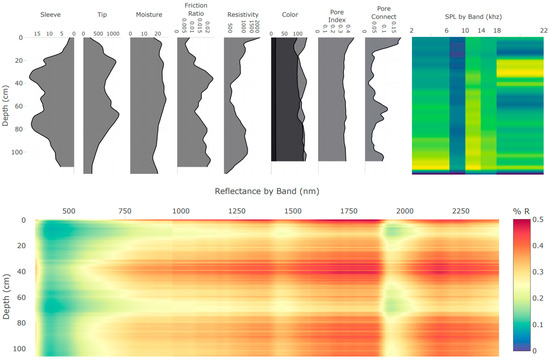 The integration of multiple independent proximal soil sensors in the DSC Probe enhances the capacity to capture a comprehensive picture of the soil properties and the in situ relationships to each other. Each sensor modality offers a unique perspective on the soil properties, and, when combined, they provide a multifaceted characterization of the soil profile (example sensor vertical plots are provided in Figure 4 and imagery is provided in Figure 5). An important consideration in the development of the DSC System is the interplay of the orthogonality of the sensor modalities, and the degrees of freedom in the sensor data and soil parameters of interest. Accounting for the dimensionality of information within individual sensors, such as video, audio, and spectrometry, the DSC System provides over 1200 sensor output values for each cm of soil it encounters.