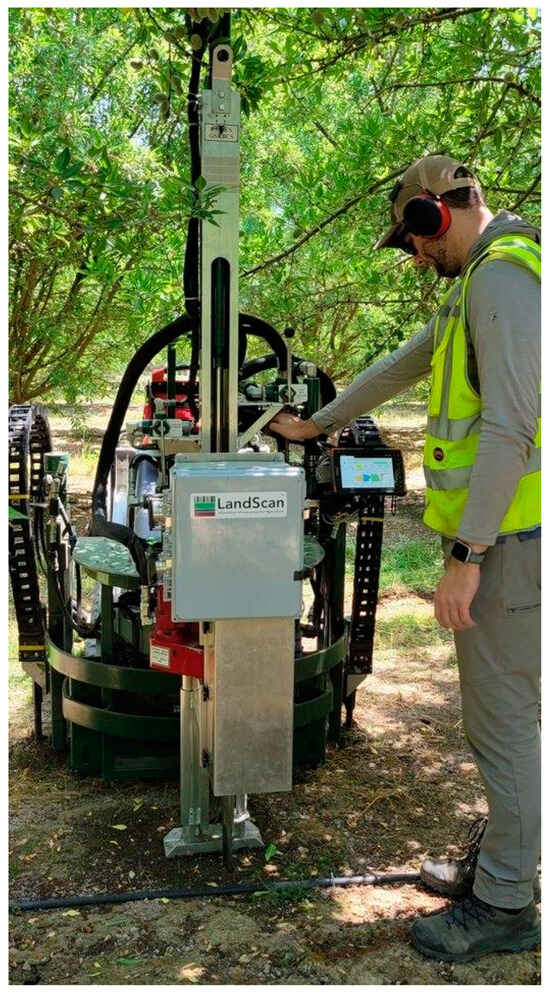 The in situ and ex situ soil data collection took place between October and December 2023. Figure 6 shows the DSC System in operation in an almond orchard.