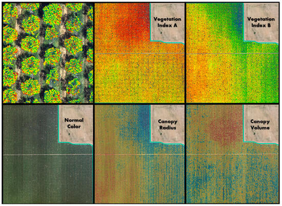 DVS data from the same flight shows how different crop metrics produce different patterns indicating unique spatial information. The top left panel shows a zoomed in view of Vegetation Index A, clipped to the tree canopy and overlain on the natural color image. The colors of Vegetation Indices A and B, Canopy Radius, and Canopy Volume show relative values using a spectral color ramp with red as the lowest values and blue as the highest values.
