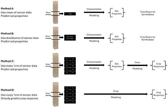 Four different methods were used to assess the model performance of the soil health and management properties. Modeling was performed with the PLSR using leave-one-out cross-validation [96]. The goal was to determine the best method of assessment between Methods A, B, and C as compared to the laboratory, and then use that method to compare to Method D in predicting the crop response (Figure 9).