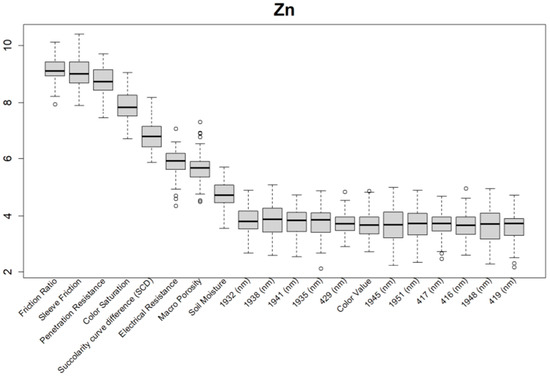Before training the predictive models for the estimation of the soil properties, the Boruta feature selection algorithm was applied to over 1200 features per cm in the DSC System dataset to obtain the importance of the sensor data that will be used in the models. The top 20 important features of soil properties and crop responses are shown in Figure 10 for zinc (Zn) and Figure 11 for the CPI. The other Boruta graphs can be found in Appendix A. For both the soil properties and crop responses, all of the features that had a Z score of more than the maximum shadow value were used for the predictions. The range of features used in the soil property predictions in this study varied from 36 to 83.