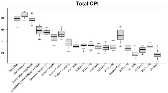 From the Boruta feature selection (Figure 10 and Figure 11; Appendix A), it was observed that most of the important features were obtained from the VNIR spectral ranges, specifically for the soil textures (clay, silt, and sand), OM, and pH. The prediction accuracies for these properties were better compared to the other soil properties estimated using the DSC System. Other DSC Probe data, such as the sleeve friction, penetration force, friction ratio, and color saturation, were the most important features, as these appeared in most of the Boruta important feature plots. Several features, such as the succolarity curve difference, electrical resistance, macro-porosity, and soil moisture, were also found to be important for the estimation of the pH and Zn. Most of the important features were found from the VNIR spectral ranges for the nutrients, except Zn. For the crop responses, all of the color properties (hue, saturation, and value), the penetration resistance, the sleeve friction, the friction ratio, the soil moisture, and the micro-porosity were found to be the most important features, followed by the VNIR spectra.