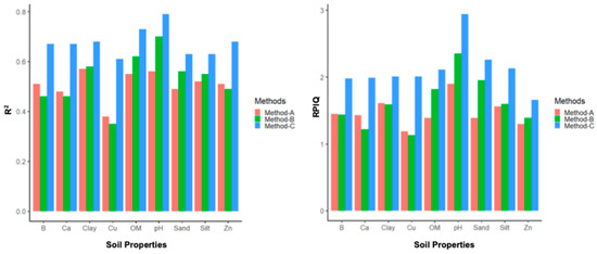 This study compared the prediction capabilities of three different methods for modeling various soil properties (OM, sand, clay, silt, B, Ca, Cu, Zn, and the pH) using DSC digital soil profiles. The results for the R2 and RPIQ are summarized by property in Figure 12, and more detail on the R2, RMSE, bias, and RPIQ per study location and property are reported in Appendix C.